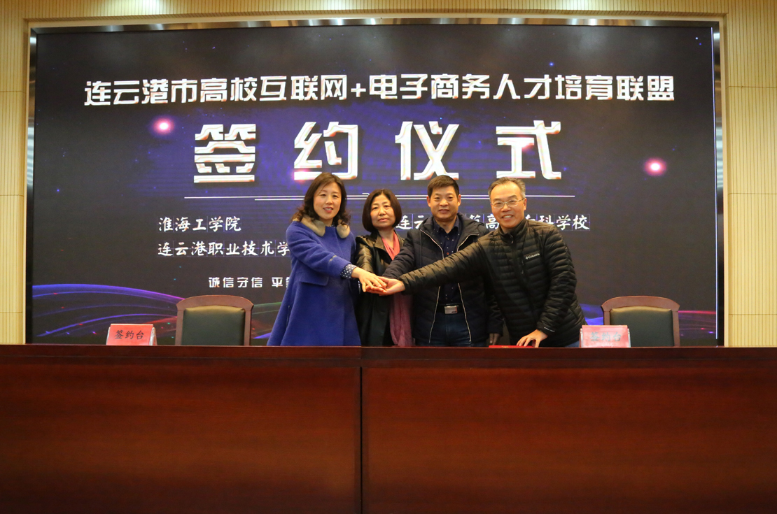 淮海工学院公司党委书记周清华代表淮海工学院与阿里巴巴项目进行百城千校百万英才跨境电商培训基地签约。明陞M88经理樊华代表淮海工学院与连云港师专、连云港职技院和江苏省财职院一起共同签定连云港市高校互联网+电子商务人才培育联盟合约。