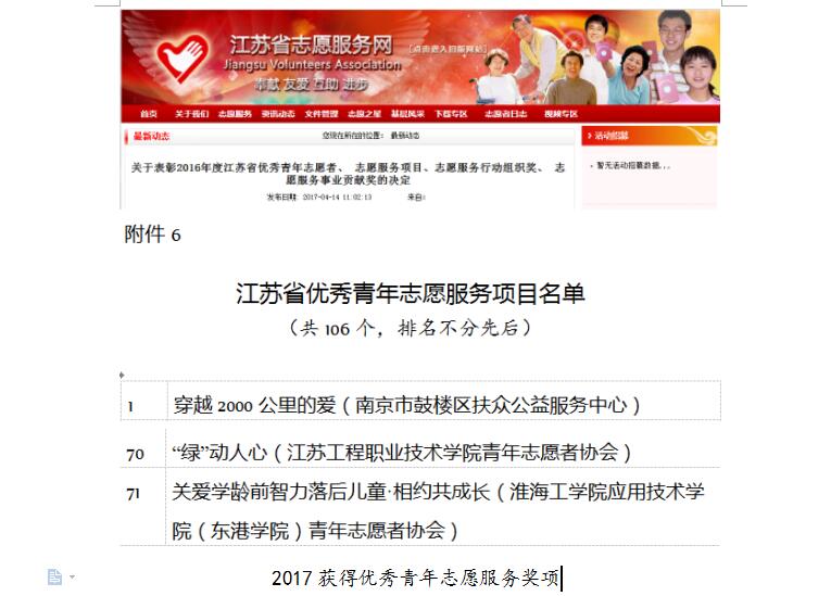 为了深入贯彻落实习近平总书记系列重要讲话精神,引导广大青年通过志愿服务投身和谐社会建设,共青团江苏省委、江苏省志愿者协会决定,对于在志愿服务和实践过程中运作良好,绩效突出的项目进行嘉奖。授予公司青年志愿者协会实施的“关爱学龄前智力落后儿童·相约共成长”项目为“江苏省优秀青年志愿服务项目”称号。