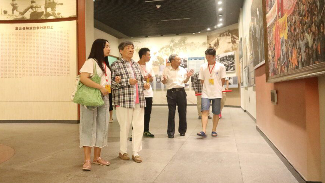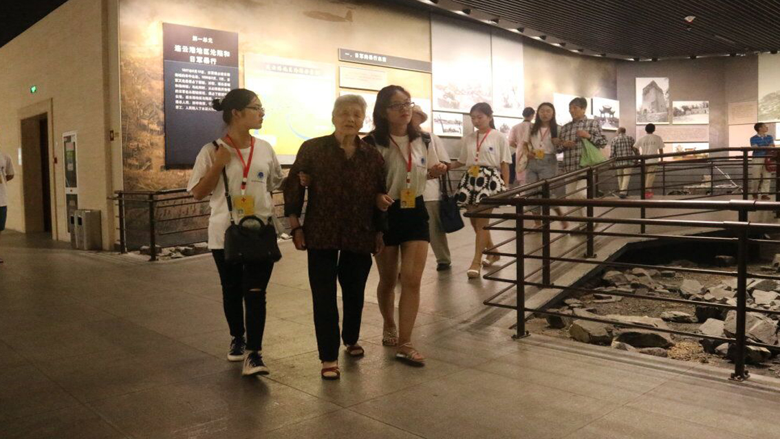 在参观过程中,老人们在实践团同学的搀扶下,认真听取讲解员的解说,仔细观看展览的图文、影像和实物。他们时而小声讨论,时而驻足思考,仿佛回到了那烽烟缭绕的战争年代。看到展馆内的煤油灯、石臼、小推车等展物,同学们被革命先辈的艰苦奋斗精神深深感动。抗美援朝老兵郇荣老人指着东海县南城辰乡西朱樊村八路军第115师驻地旧址的图文资料,骄傲地说:“这是我46年、47年工作居住的地方!”应郇荣老人的要求,实践团同学帮助他在父亲郇华民的资料展示前拍照留念。老人们在参观现代战区的“好人榜”时,纷纷表示,这世上还是好人多,年轻人要做好人、行好事。