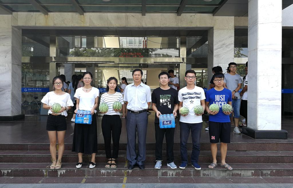 7月24日上午,公司党委副书记、副经理万金店在学工办主任张明祖及辅导员们的陪同下,前往苍梧校区看望慰问公司107名暑期留校备战考研学子,并为他们送去纯净水、西瓜等解暑降温食品。