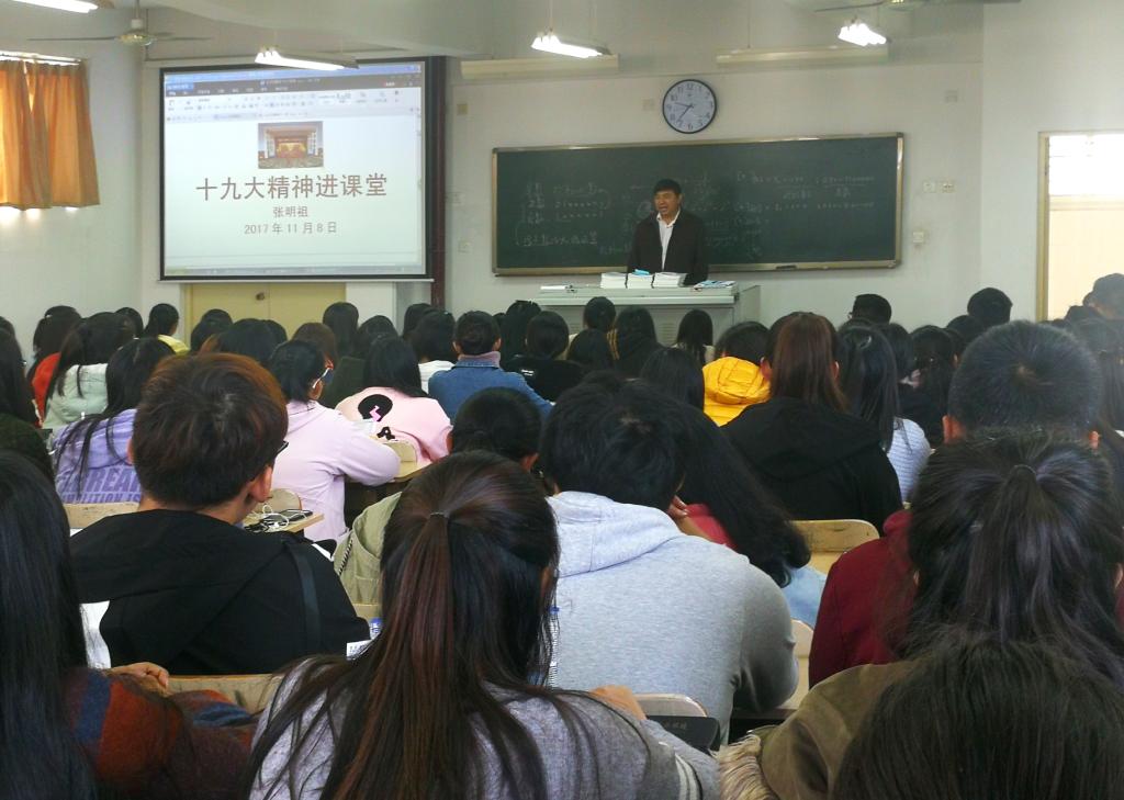“党的十九大报告指出,中国共产党人的初心和使命,就是为中国人民谋幸福,为中华民族谋复兴,这个初心和使命是激励中国共产党人不断前进的根本动力……”11月8日上午的中国近代史纲要课上,来自公司G财务171、G营销171、G会计171三个班级的近120名同学认真聆听着主讲教师张明祖副教授所作的党的十九大精神传达。