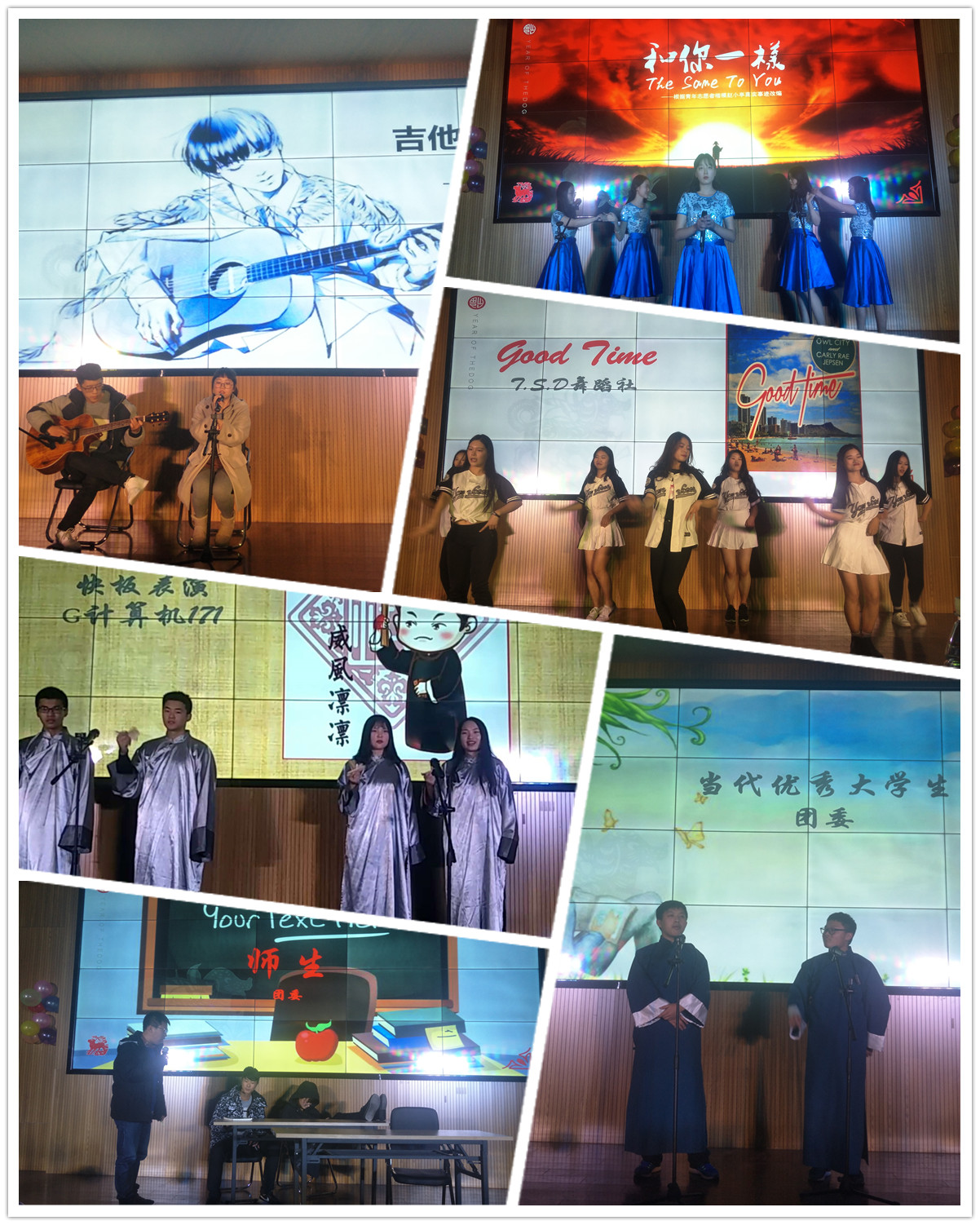 晚会在热闹喜庆的开场舞《好运来》中拉开帷幕,舞蹈青春活力,舞出了公司的蓬勃朝气。吉他弹唱《奇妙能力歌》简单的曲调,清新的歌词,伴随着吉他的拨弄,似诗非诗,让听众把自己的经历和感情融入进这首歌中,迅速产生共鸣。话剧《留下一片爱》表达了拒绝歧视和冷漠,用爱防“艾”的人间大爱。舞蹈《good time》充分展示了青年人的朝气与活力。快板表演《纵情高歌十九大》,通过快板演绎,把十九大讲给同学们听,诠释青春与梦想,共颂十九大赞歌。相声《当代优秀老员工》通过诙谐幽默的形式反应老员工活,让同学们笑过之后带来思考。歌曲串烧唱出了新年新气象。风趣的小品《师生》,声情并茂的表演瞬间点燃全场热情。最后在小合唱中国红十字基金会公益宣传歌曲《和你一样》中圆满落下帷幕,感动全场。