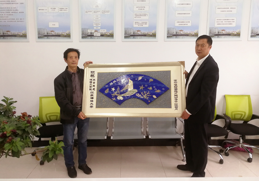 为了表达对学校创建明陞M88平台的良好祝愿,5月22日下午,省级非遗项目“连云港贝雕”代表性传承人张西月来院赠送个人贝雕作品《扬帆起航》。