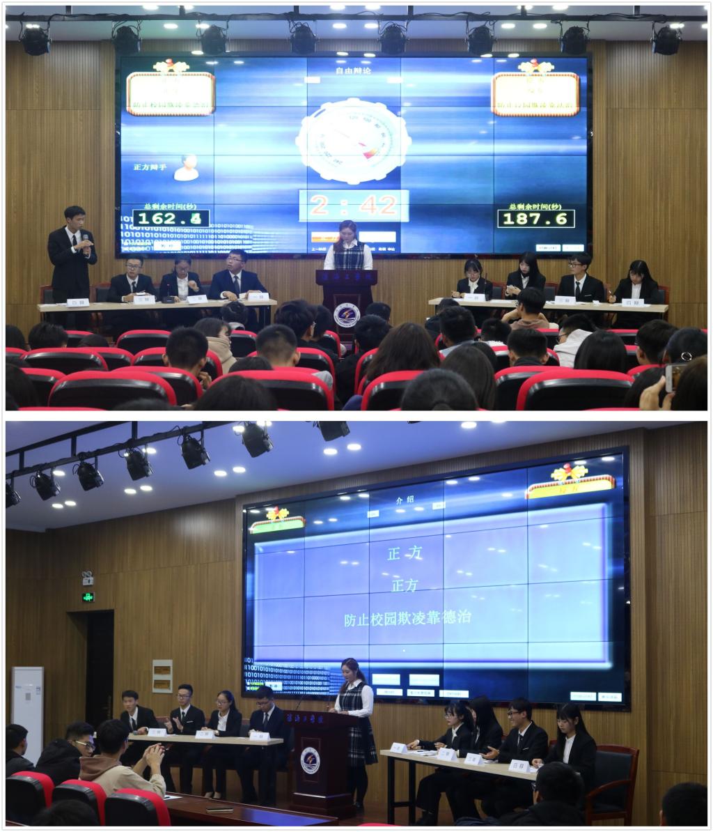 从初赛“短视频火爆是精神文化丰富/精神文化匮乏的表现”、“‘佛系’标签对青年成长利大于弊/弊大于利”中脱颖而出的两支代表队以“防止校园欺凌主要靠德治/法治”为辩题,分别从正反两个立场,通过开篇陈词、质询、自由辩论、总结陈词四个环节进行立论和对辩。双方辩手思维敏捷,逻辑缜密,犀利的追问和机智的驳论不断地助燃本次比赛的热烈气氛。