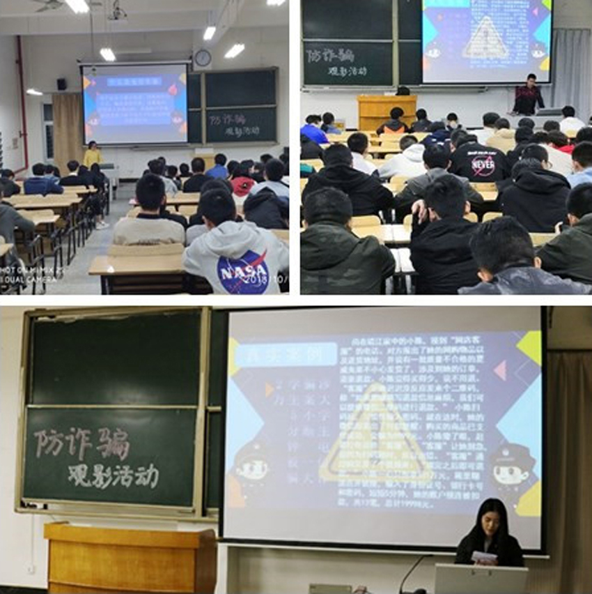 观看电影“巨额来电”,解密诈骗手段。为了让同学们对于生活中常见的诈骗进行初步了解,公司通过主题班会的形式,在全院范围内组织新生观看“防诈骗”微电影,以生动形象视觉冲击展示电信诈骗危害性。