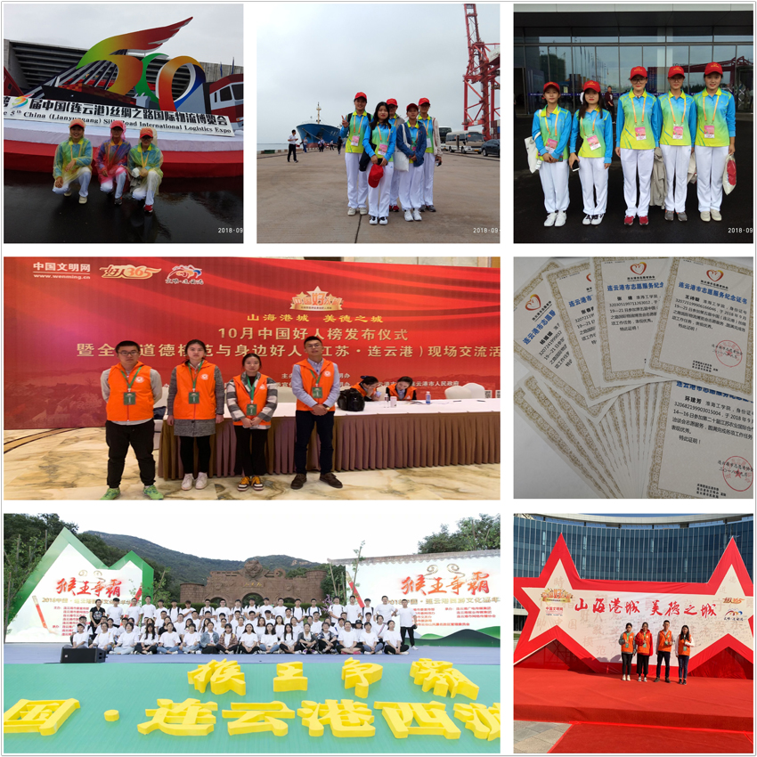 本学期,公司青年志愿者协会先后参与了山海港城、美德之城·10月“中国好人榜”发布仪式,第二十届江苏农业国际合作洽谈会,第五届连云港丝绸之路国际物流博览会、2018中国·连云港西游文化嘉年华-猴王争霸赛等大型赛事、会议,助力青春力量。