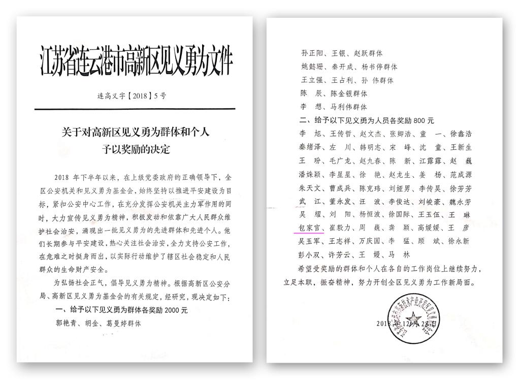 近日,学校接到高新区见义勇为基金会《关于对高新区见义勇为群体和个人予以奖励的决定》文件及奖金,公司辅导员包家官获得见义勇为个人奖励。