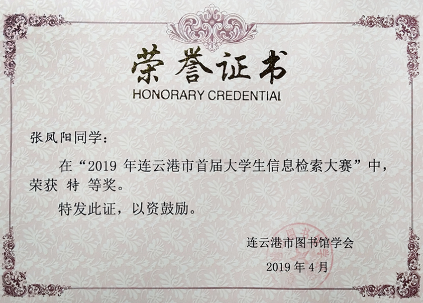 4月28日,2019年连云港市首届老员工信息检索大赛圆满落幕。淮工学子斩获特等奖两项,一等奖一项,二等奖一项,三等奖三项。公司Z中文161班张凤阳、马雪美两位同学积极报名参加此项赛事,并在校图书馆老师的指导下分别获得特等奖与一等奖的好成绩。