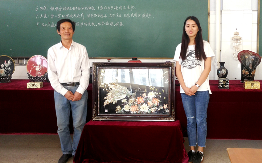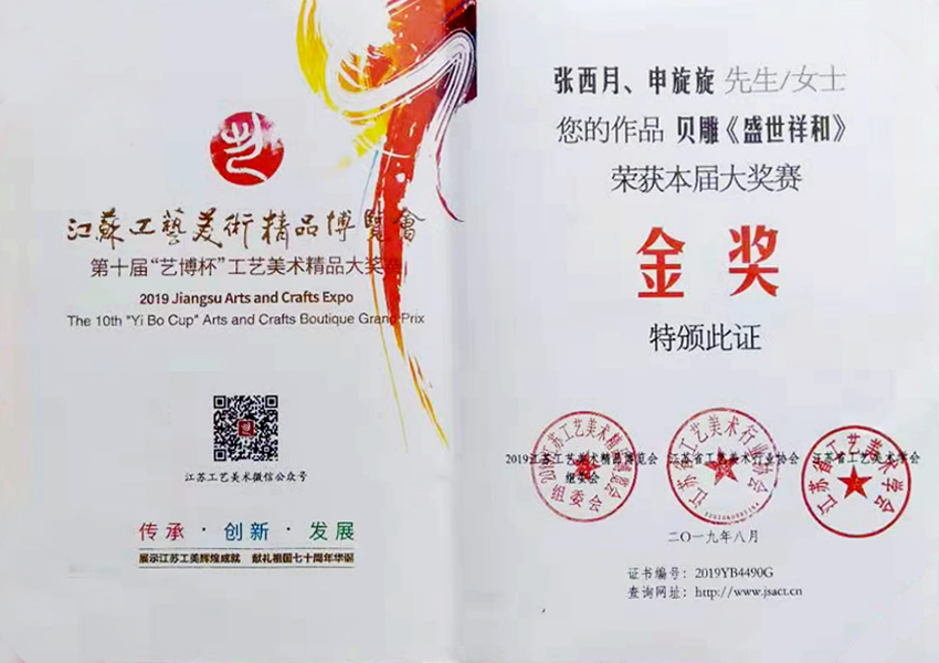 近日,由公司外聘关工委副主任张西月设计,公司G机械182班申旋旋同学参与制作完成的贝雕作品《盛世祥和》喜获2019江苏省第十届“艺博杯”工艺美术精品大奖赛金奖。