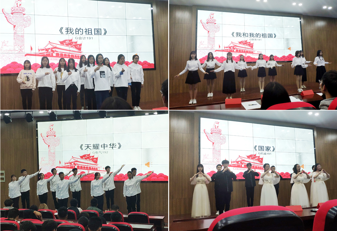 经过预赛比拼,共有9支队伍进入决赛。同学们以饱满的精神和优美的姿势,演绎着一首首爱国歌曲,他们舞动着手指,用微笑的面庞诠释着爱的内涵,传播着爱的希望,指跃飞扬,妙不可言。其中,《国家》、《我和我的祖国》、《天耀中华》等歌曲的表演尤其令人印象深刻,让在场观众深深感受到浓浓的爱国情怀。经过激烈的角逐,G财务181、G机械191、G机电171和G会计191等班级分获一、二、三等奖。