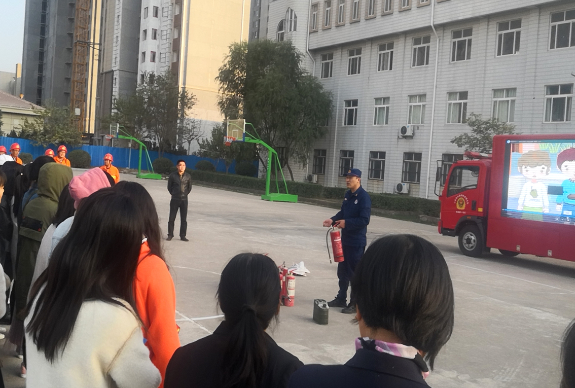 高新区消防大队消防安全宣传车也开进校园,宣传《消防法》和日常生活中消防安全常用知识。消防官兵向师生展示了我市消防支队的常用消防、救援装备。在篮球场消防官兵讲解了手提式干粉灭火器的使用方法,并示范了灭火器对油盆灭火,同学们踊跃申请出列,体会灭火器灭火,亲身感受火场扑灭初期火灾。