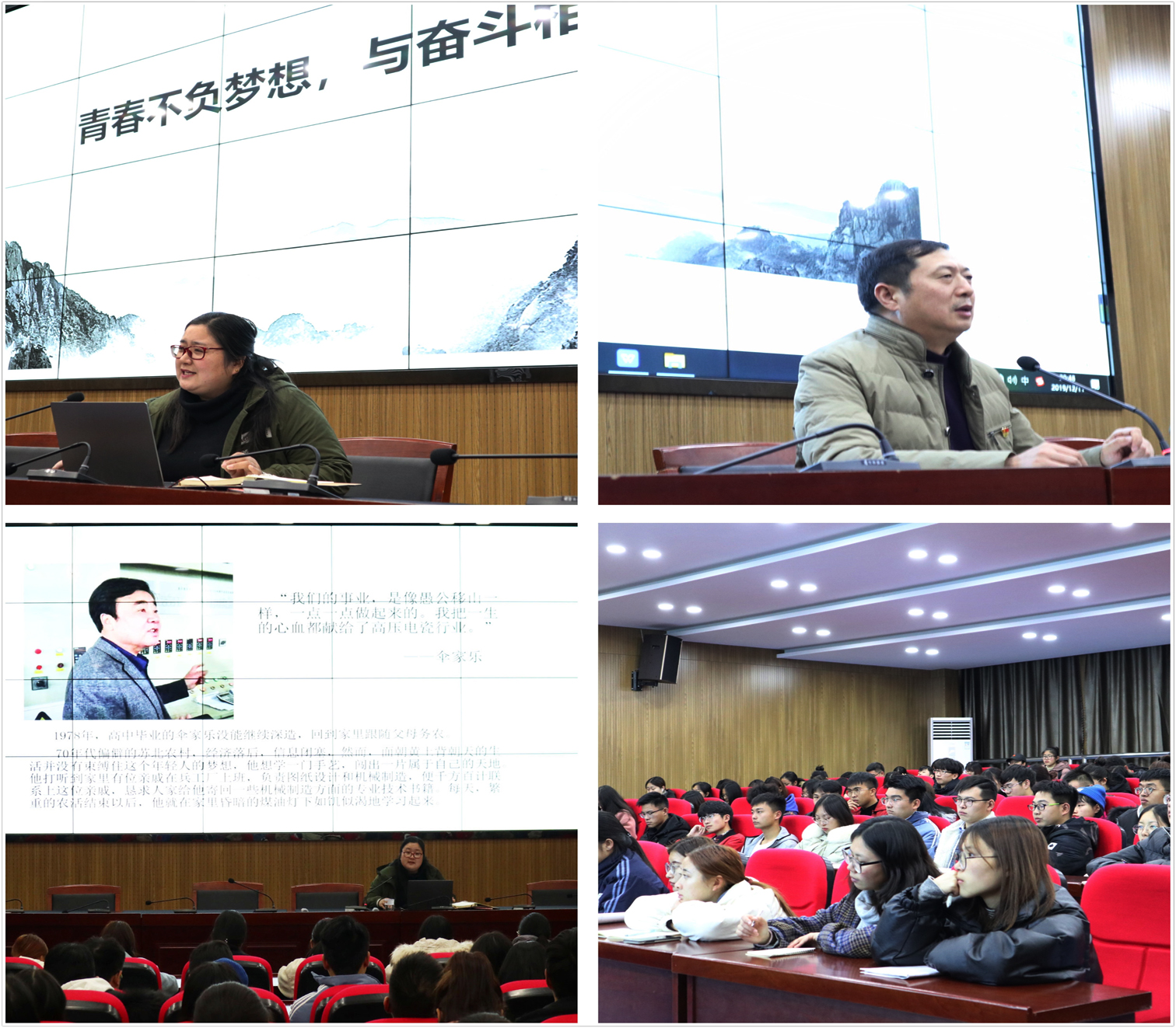 田华从“企业家是什么样的人”、“员工企业家的故事”、“为什么要努力变得优秀”和“大学做什么”四个方向作为切入点,阐述了老员工创新创业的意义,并分享了乡镇企业家连云港石港高压电瓷有限公司总经理伞家乐、优秀员工企业家张春香等创业经历,为大家讲述当代青年人应有的创新创业精神。她告诫同学们:要多了解创业领域,认清未来创业趋势,明确当下应提升自我、锻炼自己的思维,勇抓机遇,不惧挫折,不忘初心。同时田华也表示:“创业成功,仅依靠努力是不够的,还要努力学习,使自己变得更加优秀。”因为优秀往往意味着格局,眼界和视野的提升,而这些都是作为创业者必不可少的条件。