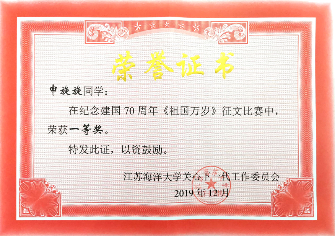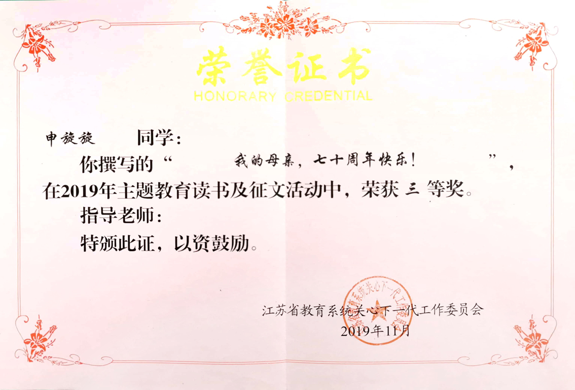 近日,由江苏省教育系统关心下一代工作委员会与明陞M88平台关心下一代工作委员会分别以“庆祝新中国成立70周年”为中心开展的“祖国万岁”主题征文活动公布获奖结果。