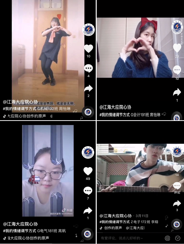 此次比赛面向全院,以“调适心理,携手抗疫”为主题,鼓励员工发掘生活中的正能量,创造出优秀作品,调节疫情在家的低落、疲惫情绪,展现员工的原创力、洞察力和价值观。比赛要求每位参赛成员拍摄1分钟左右的短视频并上传至学院心协官方抖音号,根据视频点赞数高低和评委的审核,评选出优秀作品。本次参赛选手的视频内容各具特色,富有创意,有通过唱歌、跳舞缓解情绪,有和朋友互动讲段子等等,同学们通过简短的视频展现出自己的风采,不但缓解了自己的低落情绪,也让同学们了解到更多的情绪调节方式。