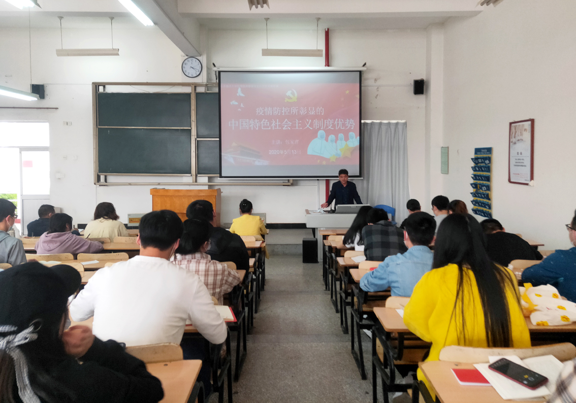 5月13日下午,员工社团党支部在敦行楼115教室举办“疫情防控中所彰显的中国特色社会主义制度优势”专题党课,党课由党支部书记包家官主讲。党支部全体党员现场聆听党课。