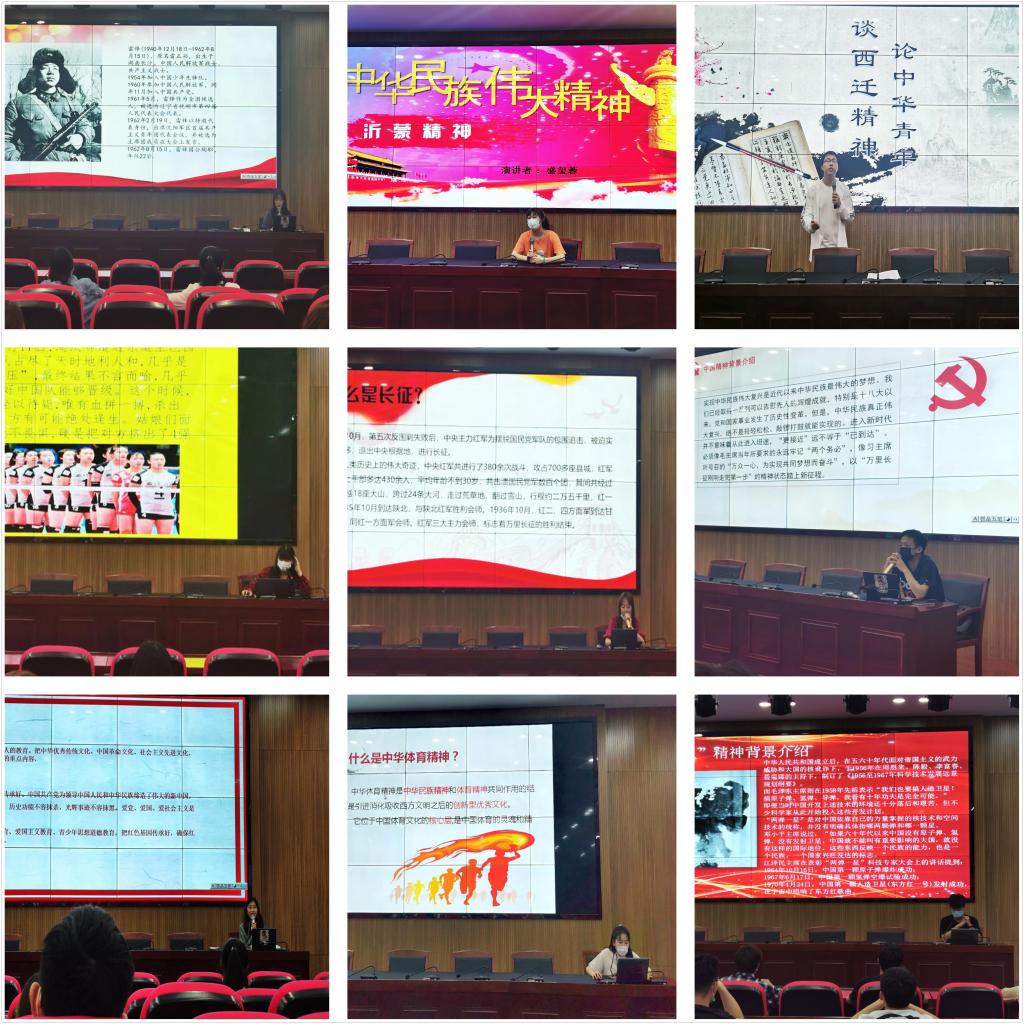 “中华民族伟大精神”青年说,由团委员工骨干刘苏辉、李嘉豪、陶媛媛、陈虹宇、李沁睿、胡廷辰、缪慧莲、展明洁、吴钰炜、杨子鉴、盛玺蓉主讲,分别从精神的具体内涵、发展过程、时代意义、青年理想等多个角度解读了五四精神、中华体育精神、“两弹一星”精神、爱国主义精神、雷锋精神、中国精神、长征精神、女排精神、延安精神、西迁精神和沂蒙精神,此外还举办了“弘扬中国精神,挺起民族脊梁”主题征文活动。