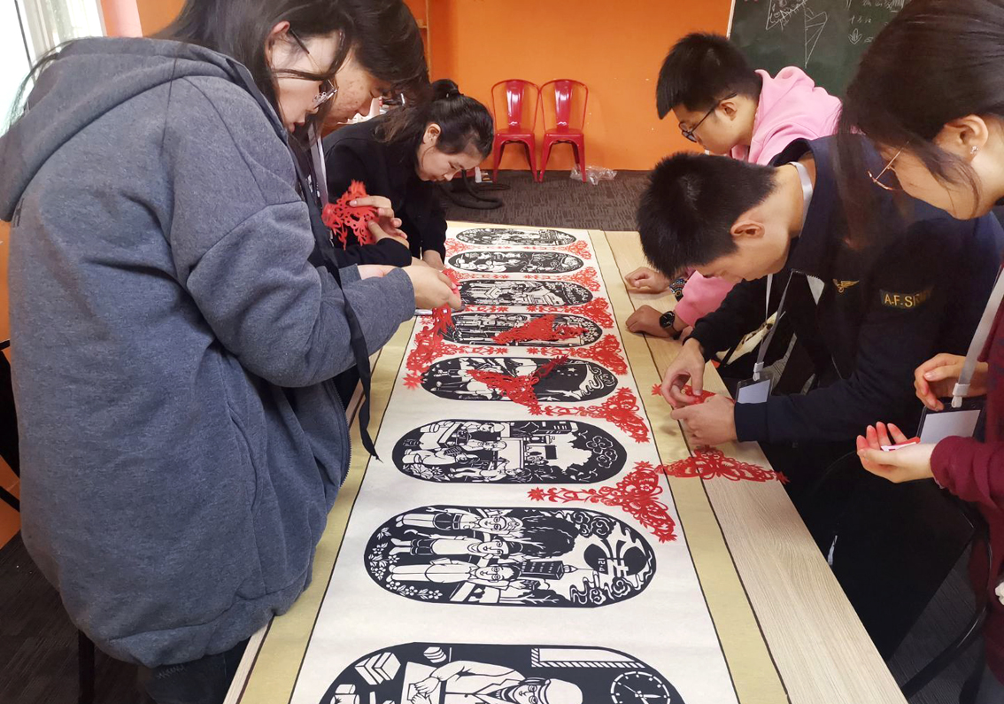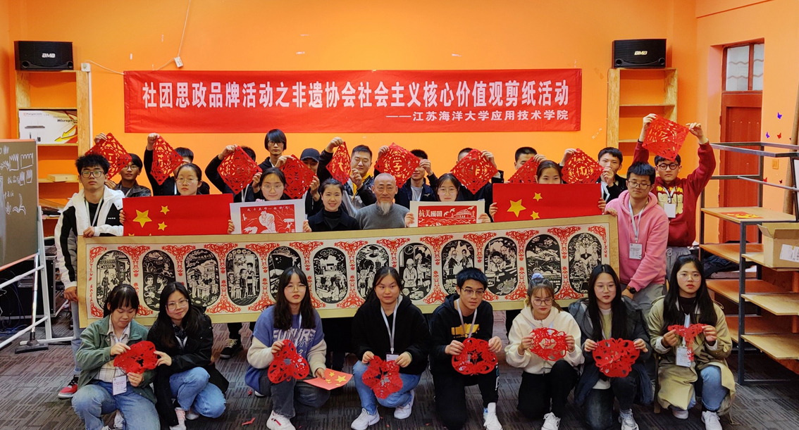 在王维良老师的现场指导下,同学们现场迅速走进了剪纸世界,领略非遗剪纸的内涵与瑰丽。大家从基础的三折剪蝴蝶等基本剪法学起,学习制作五星红旗,并一起剪裁了社会主义核心价值观。通过王老师的作品《抗美援朝英雄事迹》,初步掌握了剪纸中色彩的运用以及渐变技巧。活动之余,老师用精湛的技艺剪出“明陞M88平台非遗协会”十个大字并与大家合影留念。
