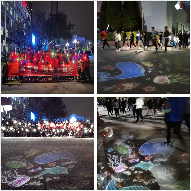 夜幕降临,同学们佩戴海洋生物的荧光饰品,迈着欢快的步伐汇聚成荧光的海洋。活动突出海洋元素,场地中设置海洋动物投影与荧光棒交相辉映。夜跑线路为从厚德楼门口出发,途径图书馆、女生宿舍、超市、食堂、员工宿舍1-6号楼,到达行健馆、最后回到厚德楼。同时为了彰显公司特色,活动以海洋知识为背景,设置了游戏“海洋食物链”和问答“诗观沧海”环节,活动不仅需要同学们之间的互相配合,更需要运用自己的海洋知识储备进行答题,以获取相应的积分,以更快的速度、更短的时间在荧光夜跑中获得好成绩。