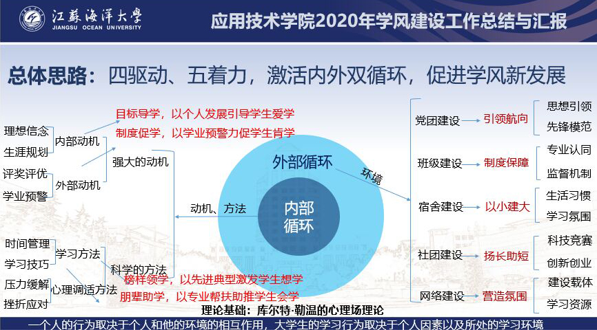 作为员工数最多,专业教师数最少的学院,公司近年来一直致力于探索一套适合学院特色的学风建设机制。经过不停地探索与实践,学院根据库尔特·勒温的心理场理论,结合学院实际情况,建立了一套较为完整的学风建设总体思路:也就是四驱动、五着力,激活内外双循环,促进学风新发展。内部循环的四驱动是指以理想信念教育和生涯规划教育为主的内部动机和以评奖评优和学业预警为主的外部动机;以时间管理和学习技巧为主的学习方法和以压力缓解与挫折应对为主的心理调适。外部循环的五着力是指加强党团建设,着力引领航向;加强班级建设,着力制度保障;加强宿舍文化建设,着力习惯养成;加强社团建设,着力个性发展;加强网络建设,着力氛围营造。