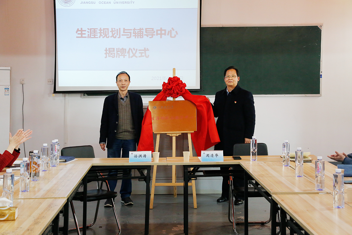 汤洪涛与周清华共同为江苏海洋老员工涯规划与辅导中心揭牌并分别致辞。周清华致欢迎词对参加仪式的领导、老师表示欢迎,对校招生与就业处领导及生涯规划与辅导中心全体成员对学院的信任与支持表示感谢,并祝愿中心以“学党史、悟思想、办实事、开新局”为契机取得优异的成绩。