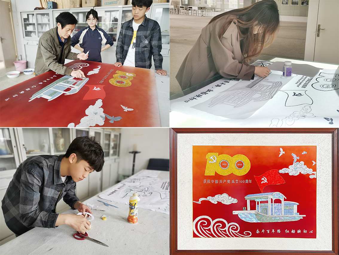 五一小长假,员工社团党支部党员、非遗协会副会长陈润欣等同学走进赣榆张西月贝雕工作室,在省非遗传承人张西月老师的指导下开始了建党100周年主题贝雕制作。他们运用螺钿工艺制作了“红船映初心”贝贴画制作。历时多日,这幅长1.2米宽0.9米,全程由员工自行设计制作的贝雕作品顺利完工。作品生动展示了蕴含“开天辟地、敢为人先的首创精神,坚定理想、百折不挠的奋斗精神,立党为公、忠诚为民的奉献精神”的伟大红船精神。