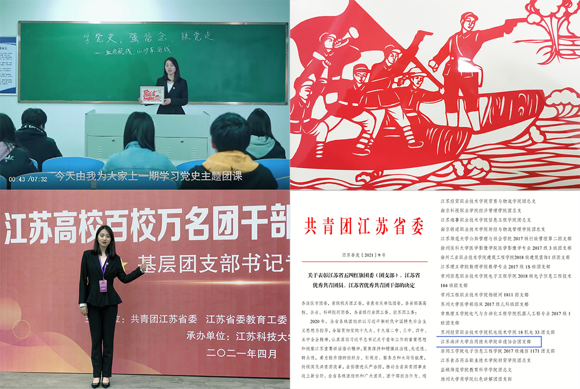 五四前夕,员工社团党支部党员、非遗协会团支书申旋旋以“血色航线”为主题,为同学们上了一堂“老员工如何传承红色基因、坚定理想信念”的主题团课。她通过手中的小沙东海战剪纸作品深情讲述了发生在连云港的党史上那段“新四军用木船对抗日军的铁艇”悲壮故事。随后又在抗日山小沙东海战烈士冢前进行了实景教学。凭借本次团课,申旋旋同学获得了江苏高校百校万名团干部思政技能大比武基层团支部书记专项赛三等奖。非遗协会团支部也荣获“江苏省五四红旗团支部”表彰。