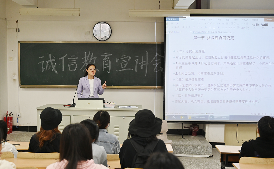5月19日在敦行楼208开展2021届毕业生诚信主题宣讲会,辅导员王晓莉宣读致《毕业生的一封信》,讲述了诚信对个人的重要性,并对诚信知识、资助政策宣传、毕业后还款方式做了详细讲解,重点强调了支付宝账户的使用及金融、防诈骗知识,现场解答毕业生关于提前还款、个人信息变更、毕业后不能按时还款、升学续贷等相关问题。