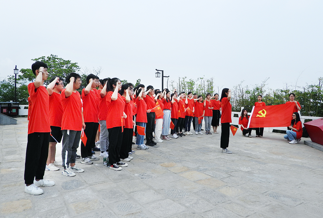 来到1997年由中共海州区委号召全体党员通过缴纳一次“特殊党费”修建的建党纪念亭“海曙亭”下,支部举行了新党员入党宣誓与老党员重温入党誓词仪式。在支部党员、省三好员工、省优秀团员、市十佳老员工、国家奖学金获得者申旋旋同学的领誓下,党员同志们面向鲜红的党旗,举起右拳庄严宣誓。铿锵有力的宣誓声穿越时空,与先烈们“永不叛党”的豪言壮语共鸣激荡,响彻山间。